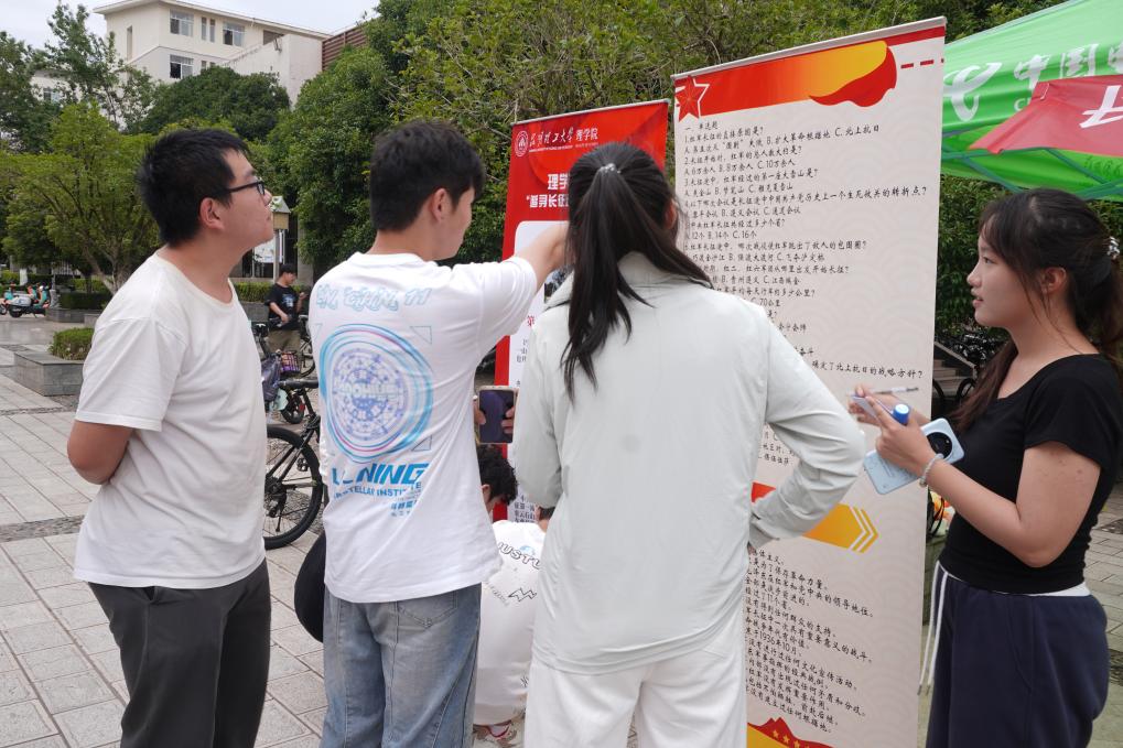 活动分别在怡园小广场、红土会堂门口、图书馆门口以及双子楼下设置“江西瑞金”、“贵州遵义”、“四川泸定桥”、“甘肃会宁”四大“长征站点”,各队2-6人组队完成集章任务。同学们在四个站点通过长征知识问答、红军标语书写、红色歌曲传唱、中国地图拼合沉浸式的长征历程体验,对长征精神有了更加深刻的理解。